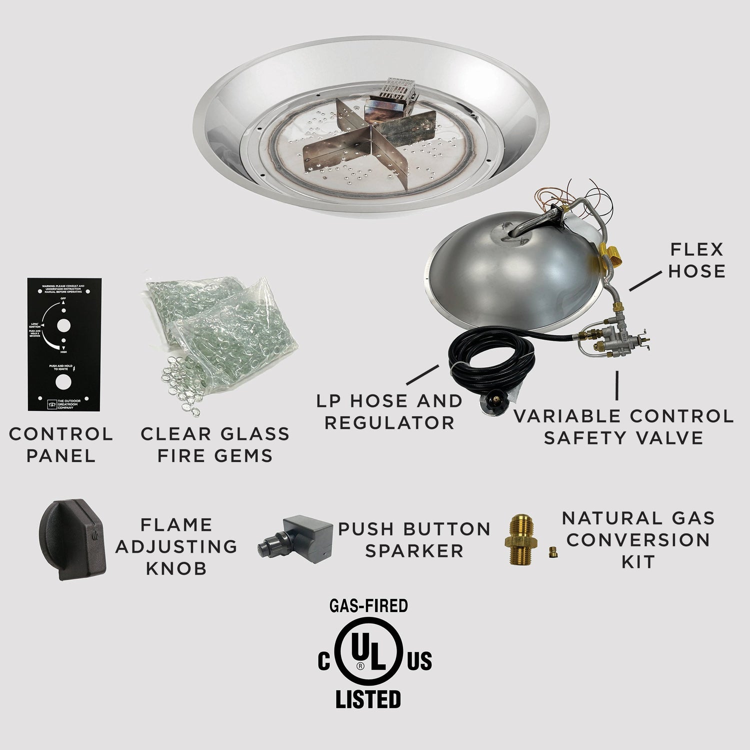 - Includes Variable Control Safety Valve, LP hose and regulator, metal flex hose, control panel, clear tempered fire glass gems